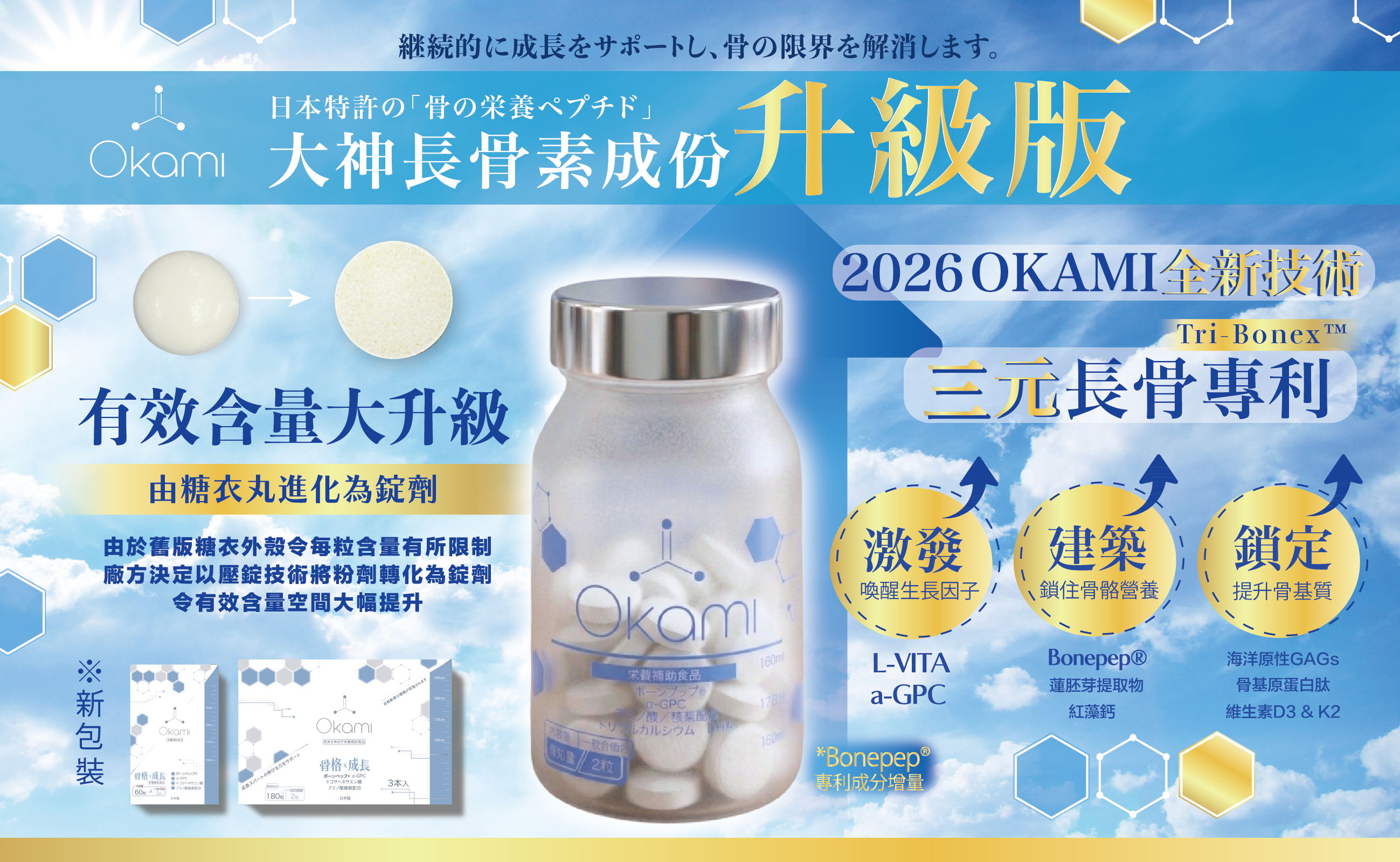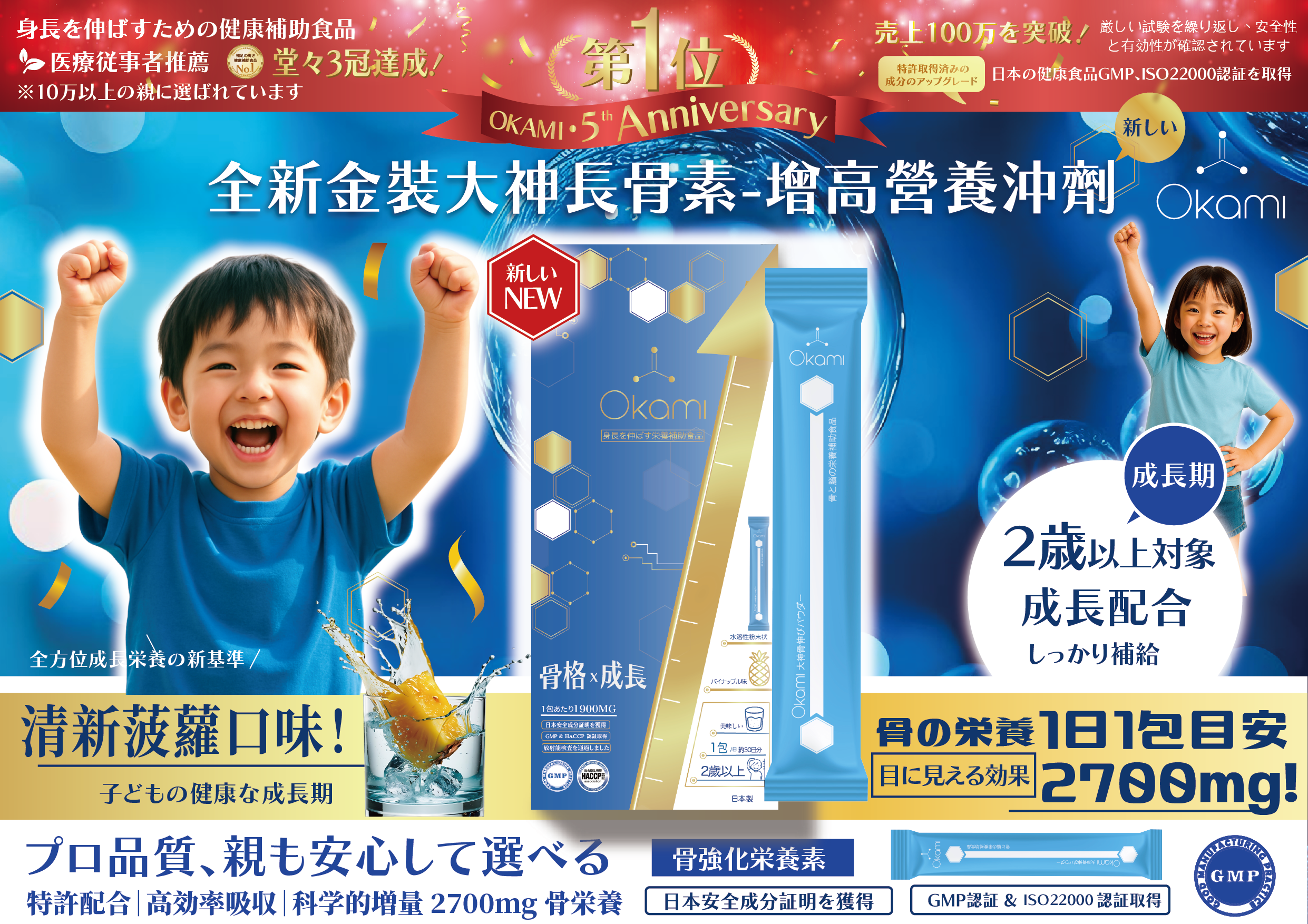 日本樂天排名NO.1 - OKAMI日本大神長骨素(升級版加強配方|增高 骨骼成長 發育 補腦 兒童成長 增高丸 天然保健品)